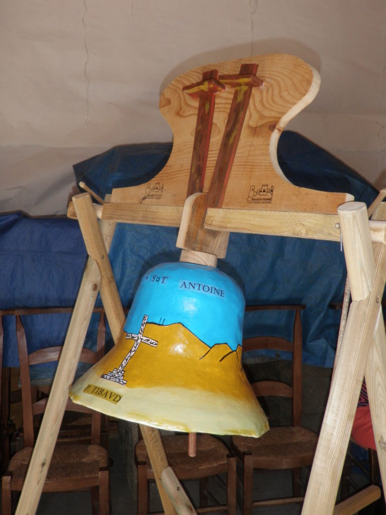 En octobre 2012, une exposition, jouxtant l’église de Blacons, a pu montrer aux visiteurs des photos de cette cloche. De format modeste (31 cm de haut, 37 cm de diamètre maximum, 2,4 cm d’épaisseur), elle mentionne le nom de P. Tibaut, qui peut être le fondeur. « St-Antoine priez pour nous » est gravé dans le bronze, ainsi que la lettre grecque Tau (emblème des Antonins).