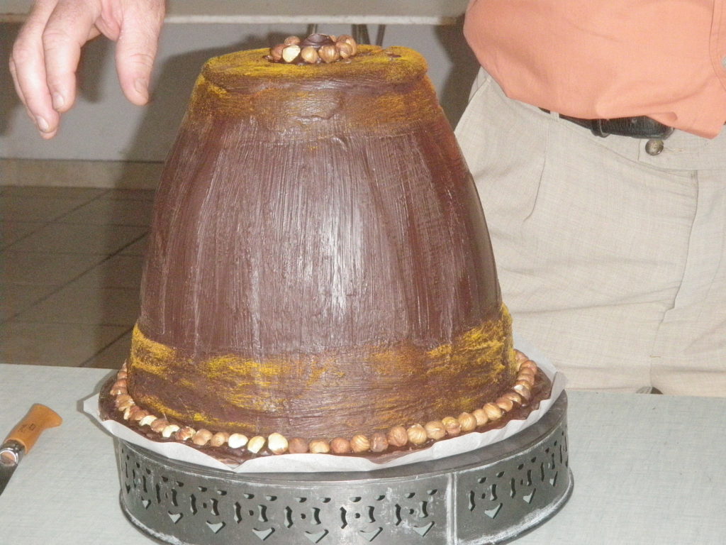 L’autre idée qui avait germé au sein de l’Association Mirabel était la fabrication d’une réplique à l’échelle de cette cloche. Roger Amblard, déjà grand artisan de l’exposition, a conçu et fabriqué en papier durci et armé cette fausse cloche, ainsi que le châssis permettant son transport. Mimi Gatefait a parfait la décoration d’une belle représentation panoramique du paysage de Mirabel, en jaune et bleu. A la fin de l’exposition, une procession est partie, remontant à dos d’homme la cloche dupliquée, de Blacons vers Mirabel, où tout le monde s’est retrouvé, sur la terrasse de la Maison de Mirabel (ancien temple). Deux belles surprises ont alors séduit le public : de l’ancienne église, ruinée, ont jailli les vrais sons de la cloche, enregistrés par Philippe Sibelle dans le clocher d’en-bas, et reproduits majestueusement dans tout le village perché. Certains allaient jusqu’à dire que le cloche n’avait peut-être jamais aussi bien sonné dans Mirabel. La deuxième surprise était offerte par l’association et la chocolaterie du village : « Le tiroir au chocolat ». Une magnifique cloche, en délicieux chocolat de Sao Tomé, avait été fabriquée par Line Renoux, aidée de Véronique Gencel. Avec son poids de 1,7 kg et ses dimensions proches de la cloche de Mirabel, solennellement cassée par Christian Espinas, président de l’Association, la cloche en chocolat a permis aux visiteurs et amis de Mirabel un beau moment de dégustation, avant une dernière volée campanaire pour clore une commémoration peu ordinaire.